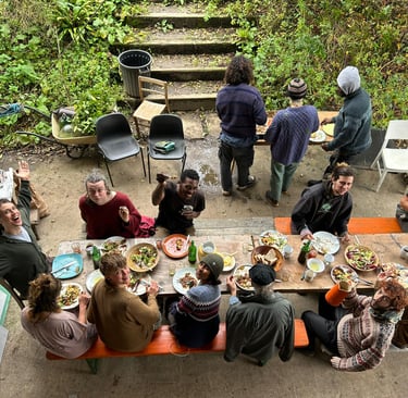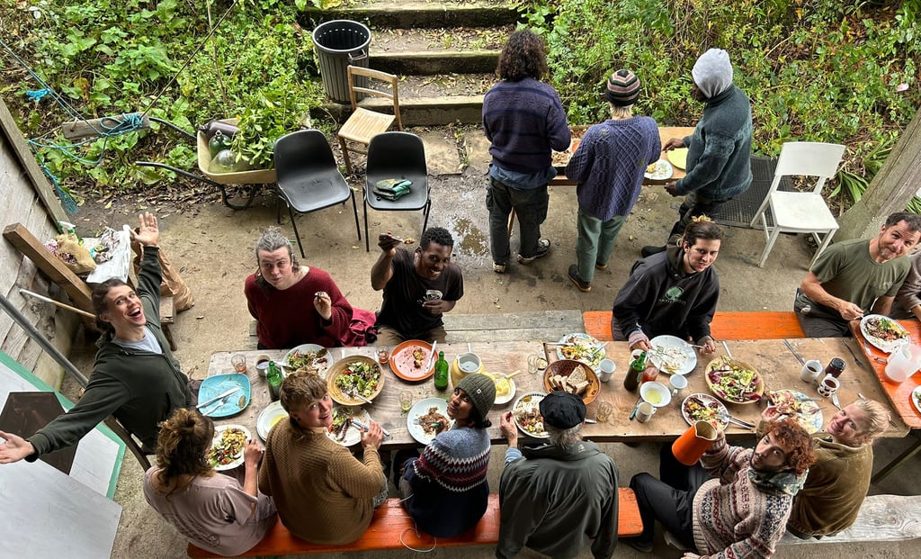 There is a place at the end of a thicket-fenced lane, where a pheasant roams between sheep on a buttercup-jeweled hillside. And the sea, in all its glorious, glassy blue, sags down on the horizon as rainwater collects on loose tarpaulin. And hedges and fences sew scars across fields, quilting together patchworked pastures with grasslands and gardens. There is a place where days stretch out like unfurling palms, where time is an expanse punctuated only by the ring of the barn bell and the sun switching stools with the moon. Where a group of us, strangers, come together to imagine different ways of being, in community with each other. Where we saw and hammer and drill to the strum of a guitar and the hum of a tin whistle. Where we carve out new ways of living in timber, and fill in the gaps with straw. There is a place, at night, where coloured tents light up like jellyfish along the slope of an orchard, glowing, just for a moment, and then fading into the dark.
